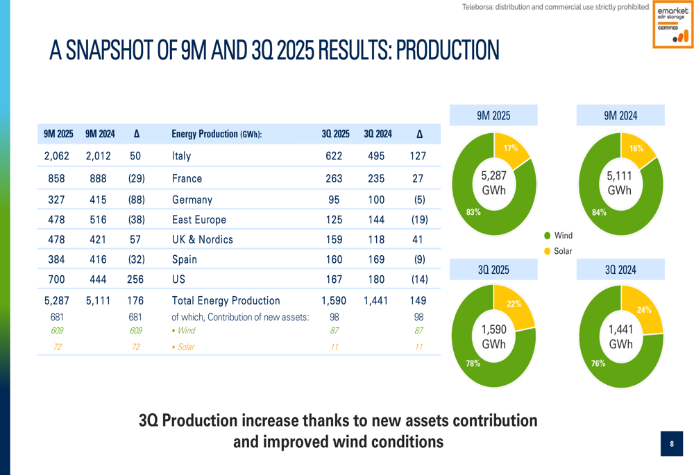 ERG's production snapshot reveals strong performance across multiple geographies, with particularly notable improvements in Italy, France, and the UK & Nordics regions during the third quarter. Total production increased by 149 GWh compared to Q3 2024.