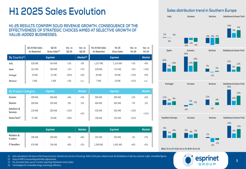 Italy remains Esprinet’s largest market, contributing €1,257 million in H1 2025 sales, followed by Spain with €628 million. The company’s product mix shows "Screens" as the dominant category with €993 million in H1 sales, while "Solutions & Services" generated €435 million, representing the company’s strategic shift toward higher-margin offerings.