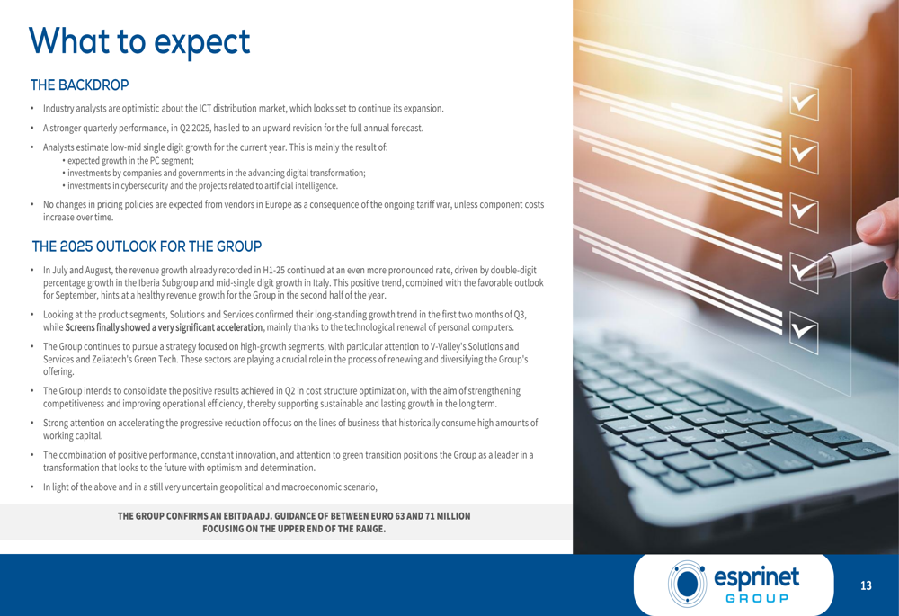 Esprinet’s outlook for the remainder of 2025 appears positive, with management noting that the revenue growth recorded in H1 2025 continued at an even more pronounced rate in July and August. The company has confirmed its EBITDA adjusted guidance of €63-71 million for the full year, focusing on the upper end of this range.