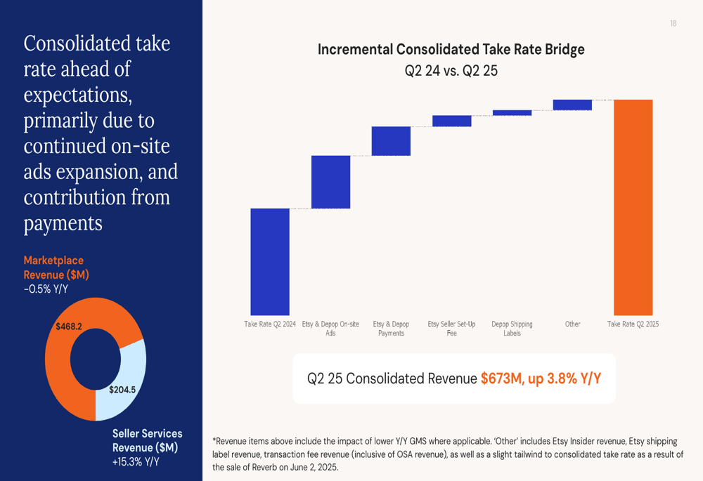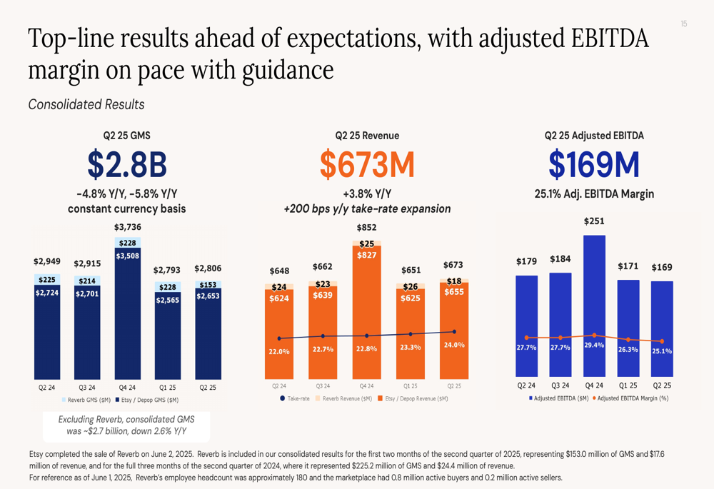 Etsy’s Q2 2025 results showed mixed performance across key metrics. While GMS declined, the company maintained strong profitability with a consolidated adjusted EBITDA of $169 million, representing a 25.1% margin. The company’s take rate reached 24%, exceeding expectations and serving as a primary driver of revenue growth despite the GMS decline.