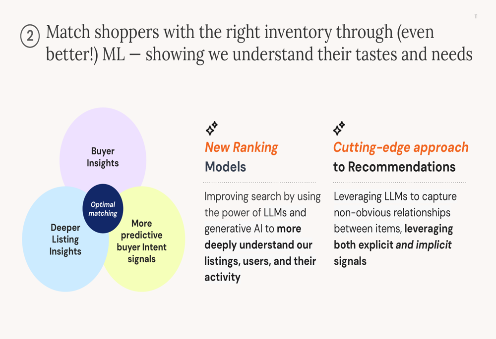 In search and recommendations, Etsy is implementing new ranking models using LLMs and generative AI to better understand listings, users, and their activity. This approach is already showing results at Depop, where there has been a 2x increase in the share of products bought from recommendations since late 2022.