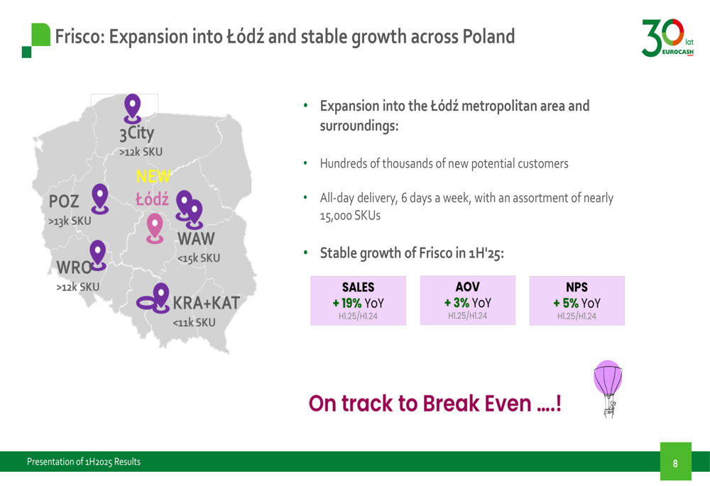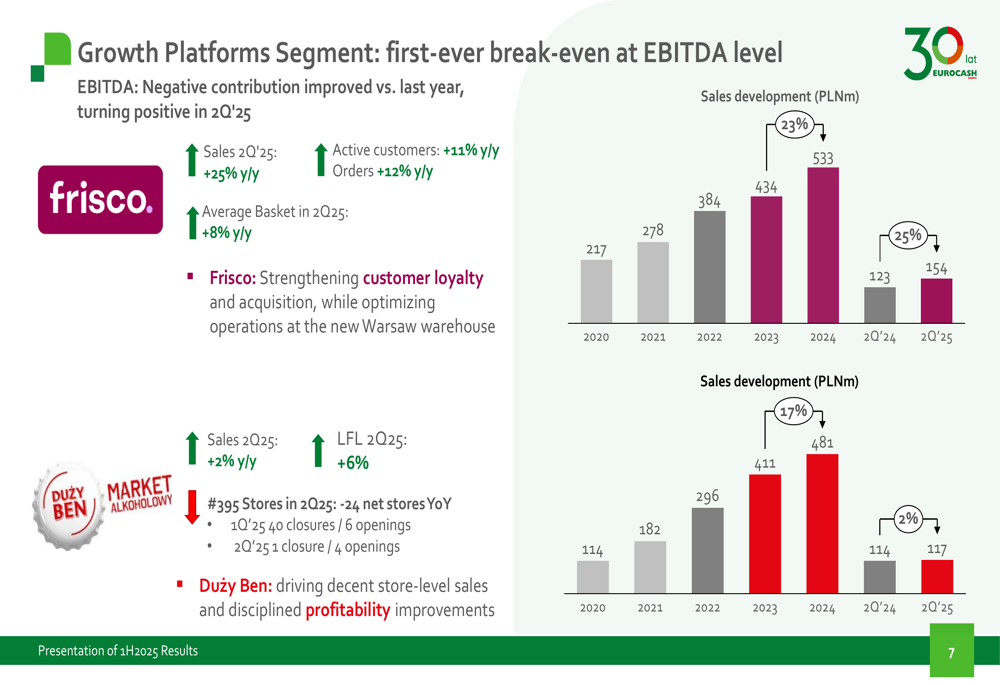 A notable bright spot in Eurocash’s results was the performance of its growth platforms, which include the Frisco e-commerce operation and Duży Ben alcohol stores. These businesses collectively increased sales by 9.6% year-over-year and, importantly, turned EBITDA-positive in Q2 2025.