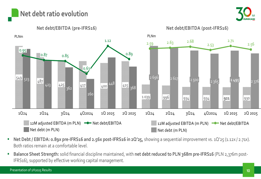 Eurocash maintained a solid financial position, with improvements in its cash conversion cycle and a reduction in net debt. The company’s net debt to EBITDA ratio stood at 0.89x pre-IFRS16 and 2.56x post-IFRS16 in Q2 2025, indicating a stable financial foundation.
