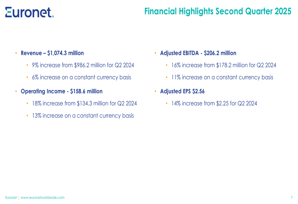 Euronet’s second quarter showed strong growth across key financial metrics, with operating income reaching $158.6 million, representing an 18% increase year-over-year (13% in constant currency). Adjusted EBITDA grew 16% to $206.2 million, while adjusted earnings per share increased 14% to $2.56 compared to Q2 2024.