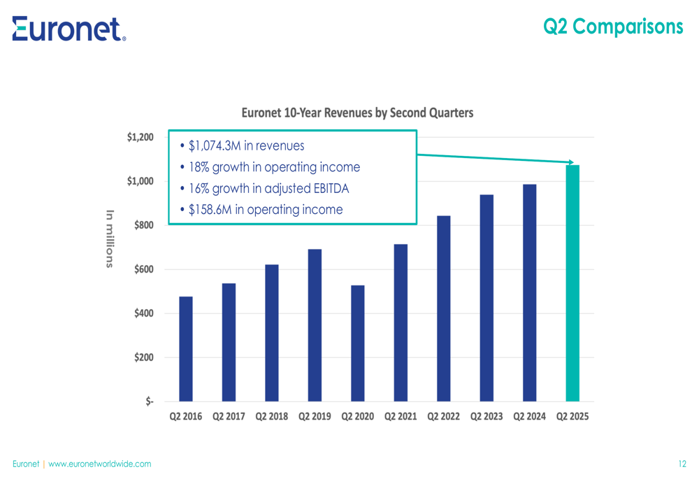 Euronet’s long-term revenue growth trajectory shows consistent expansion over the past decade, with a temporary dip during the pandemic in 2020, followed by a strong recovery and continued growth through 2025: