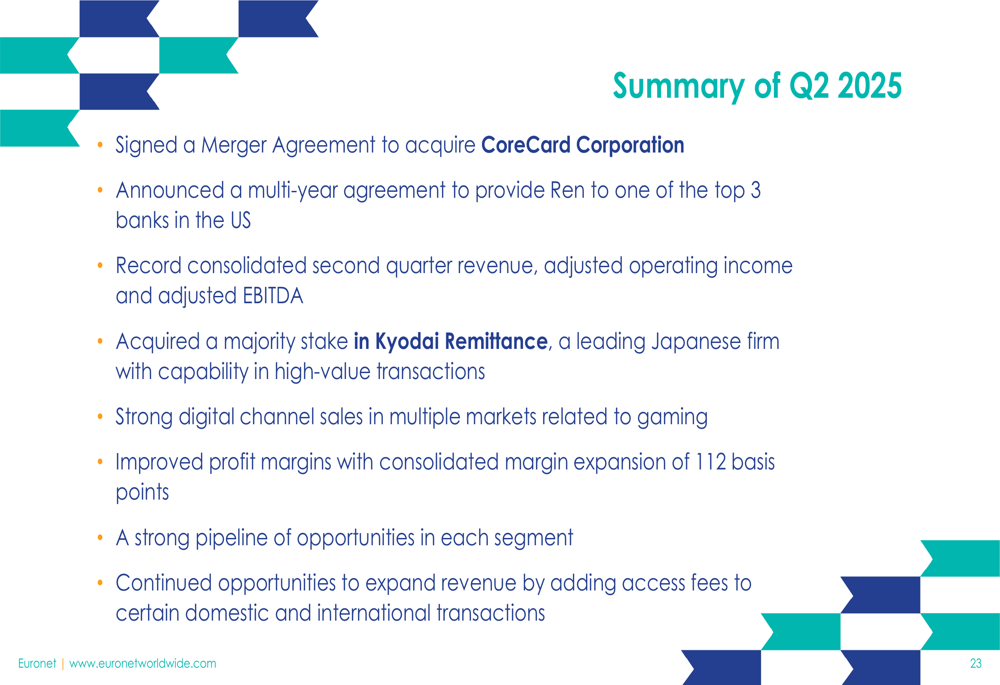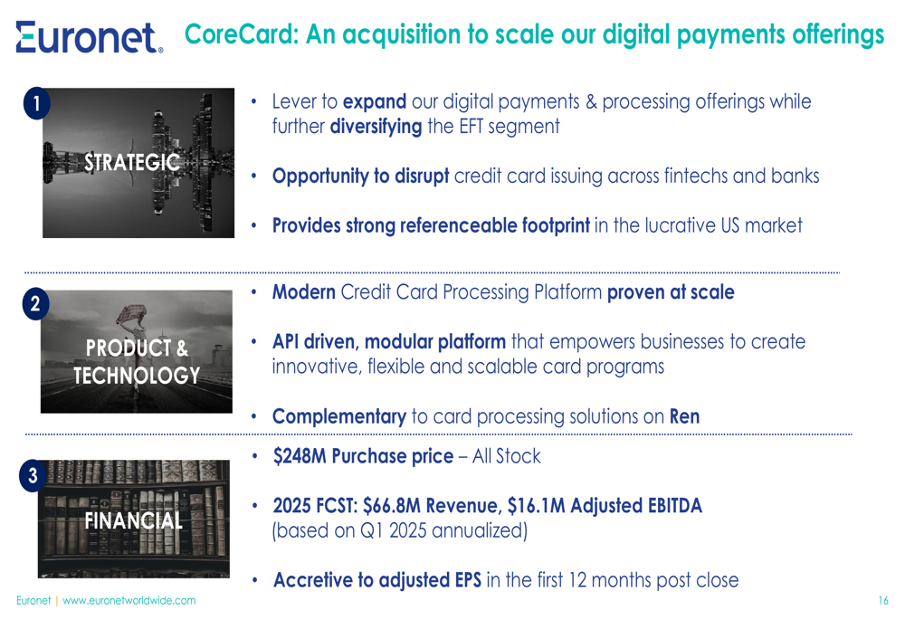 The centerpiece of Euronet’s strategic initiatives is the announced acquisition of CoreCard, which positions the company to expand its digital payments offerings and enter the credit card issuing market. The presentation highlighted the strategic rationale behind this acquisition:
