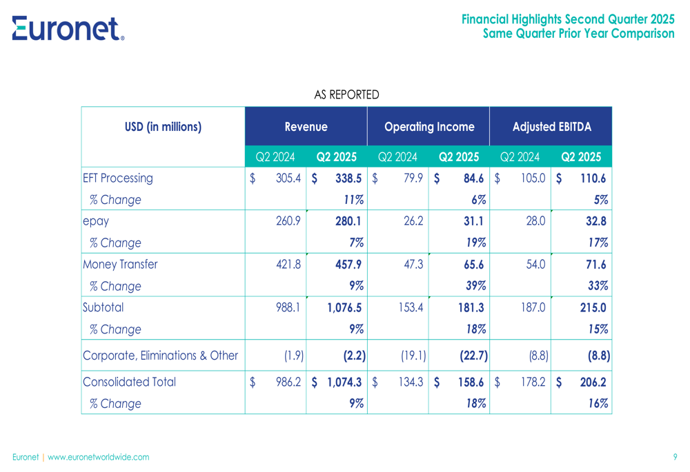 Euronet Worldwide (NASDAQ:EEFT) reported record second-quarter 2025 results, achieving $1.07 billion in revenue despite falling short of analyst expectations. According to the company’s latest earnings presentation, Euronet posted a 9% year-over-year revenue increase (6% in constant currency), while its stock showed resilience with a modest pre-market increase of 1.01% following the announcement.