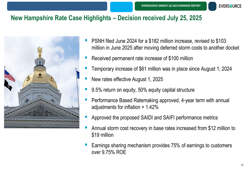 Eversource reported significant regulatory progress across its service territories. In New Hampshire, the company received approval for a permanent rate increase of $100 million, effective August 1, 2025. The regulatory decision included a 9.5% return on equity with a 50% equity capital structure, and approval of Performance Based Ratemaking (PBR) with a 4-year term.