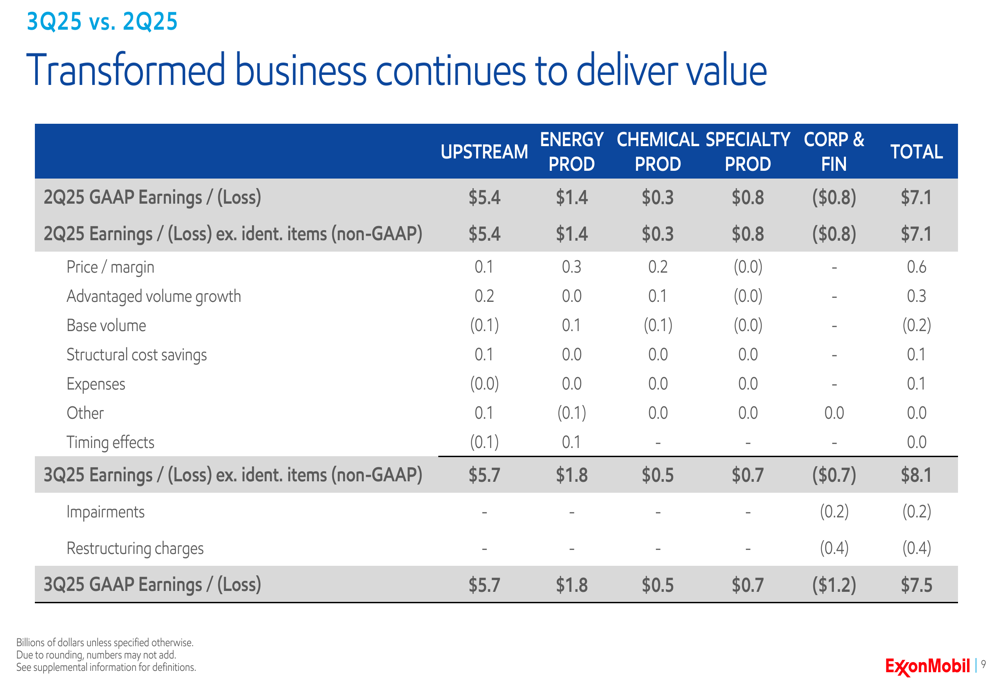 Quarter-over-quarter performance showed improvement, with GAAP earnings increasing from $7.1 billion in Q2 2025 to $7.5 billion in Q3 2025. This growth was primarily driven by favorable price/margin impacts of $0.6 billion and advantaged volume growth of $0.3 billion, partially offset by base volume decline and expenses.