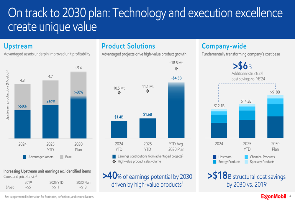 ExxonMobil’s progress toward its 2030 plan shows steady improvement in unit profitability, with upstream unit earnings excluding identified items more than doubling from approximately $5 per oil-equivalent barrel in 2019 to over $11 in 2025 year-to-date, with a target of approximately $13 by 2030.