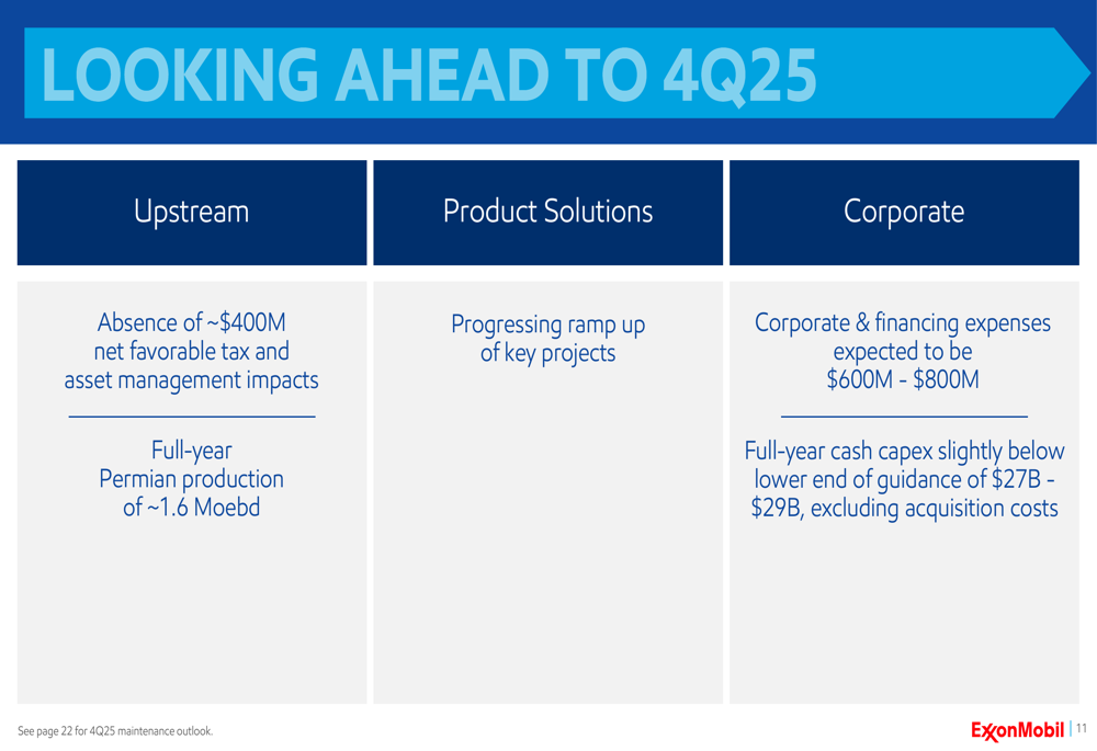 Looking ahead to the fourth quarter of 2025, ExxonMobil expects the absence of approximately $400 million in net favorable tax and asset management impacts in the upstream segment. The company projects full-year Permian production to reach approximately 1.6 million oil-equivalent barrels per day.