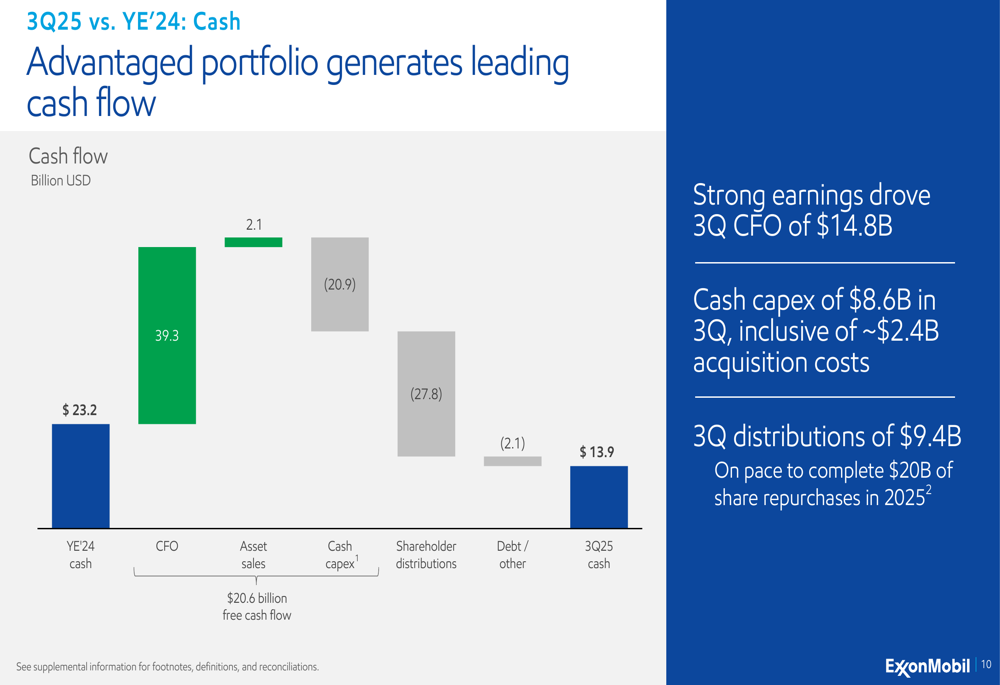 ExxonMobil’s third-quarter performance demonstrated the company’s ability to execute effectively across its portfolio. GAAP earnings reached $7.5 billion, with earnings excluding identified items at $8.1 billion. Cash flow from operations was particularly strong at $14.8 billion, driven by record production in the Permian Basin and Guyana.