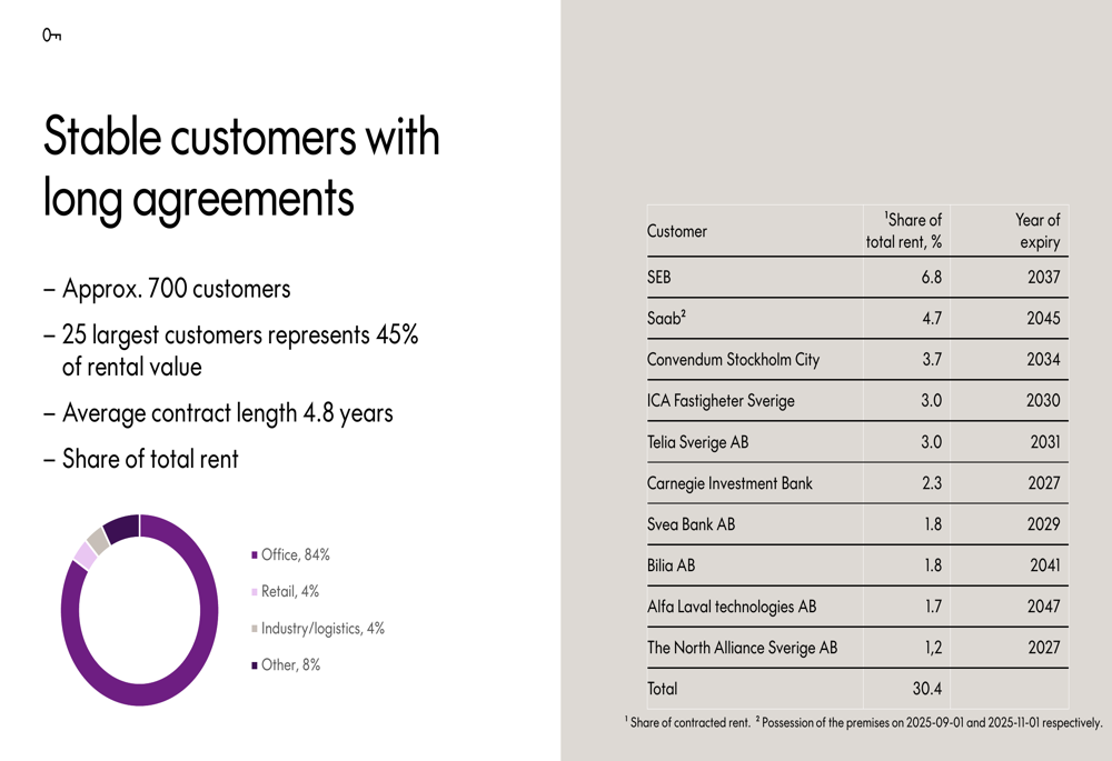 As market conditions remain challenging, Fabege’s stable customer base provides some resilience. The company has approximately 700 customers, with the 25 largest representing 45% of rental value. The average contract length is 4.8 years, providing visibility on future rental income. Office space accounts for 84% of total rent, as illustrated in this breakdown: