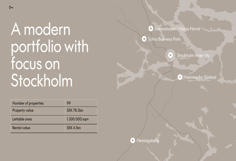 Fabege’s portfolio consists of 99 properties valued at SEK 78.3 billion, with a lettable area of 1.3 million square meters and a rental value of SEK 4.1 billion. The company maintains its strategic focus on key Stockholm areas including Arenastaden/Haga Norra, Solna Business Park, Stockholm Inner City, Hammarby Sjöstad, and Flemingsberg.