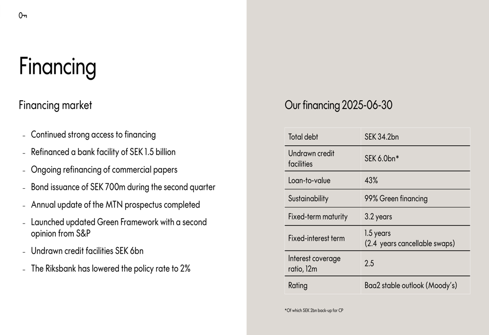 Fabege maintains a solid financial position with a loan-to-value ratio of 43% against a target of less than 50%. The company has successfully maintained 99% green financing, with a fixed-term maturity of 3.2 years and a fixed-interest term of 1.5 years. The average interest rate as of June 30, 2025, was 2.89%, reflecting the impact of rising interest rates on the company’s financing costs.