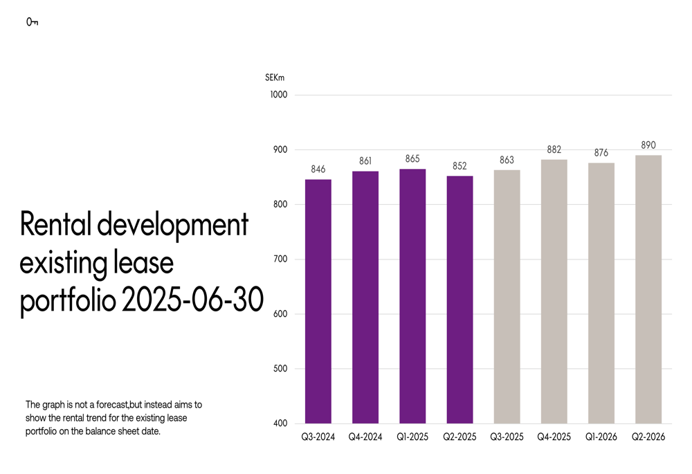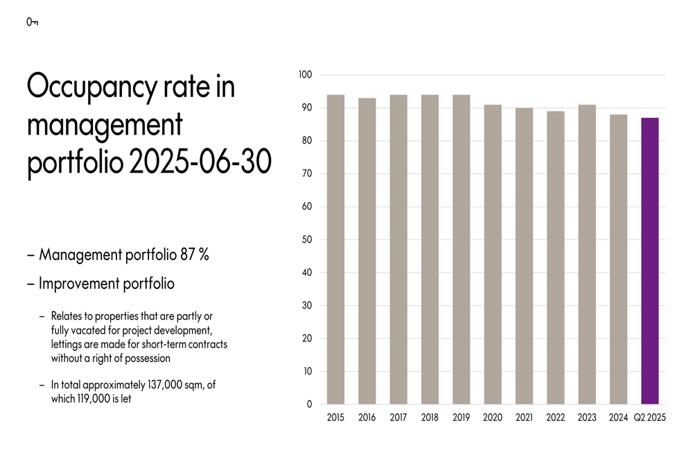 Occupancy rates have declined to 87% in Q2 2025, down from historical rates that were consistently above 90%. This trend reflects the broader market challenges in Stockholm’s office sector, as illustrated in the following chart: