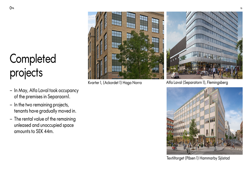 The company completed several significant projects, including Kvarter 1 (Ackordet 1) in Haga Norra, Alfa Laval (Separatorn 1) in Flemingsberg, and Textiltorget (Påsen 1) in Hammarby Sjöstad. Ongoing projects include developments in Solna Strand, Hagastaden, and Arenastaden.