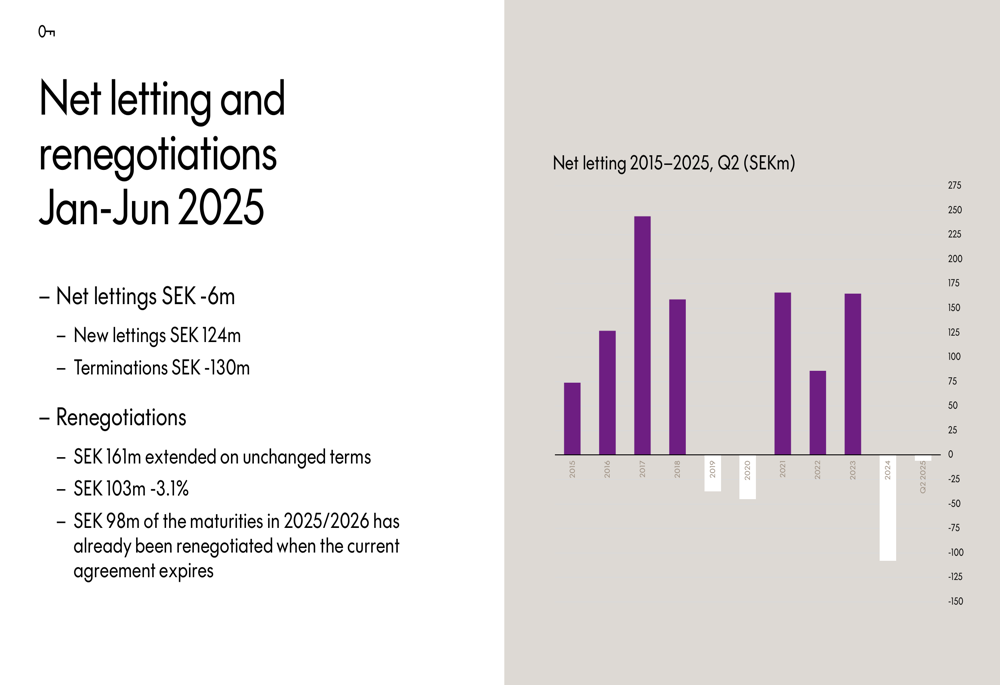 Net lettings for the first half of 2025 were negative at SEK -6 million, with new lettings of SEK 124 million offset by terminations of SEK 130 million. The company reported that SEK 161 million was extended on unchanged terms, while SEK 103 million was renegotiated with a 3.1% decrease in rates.