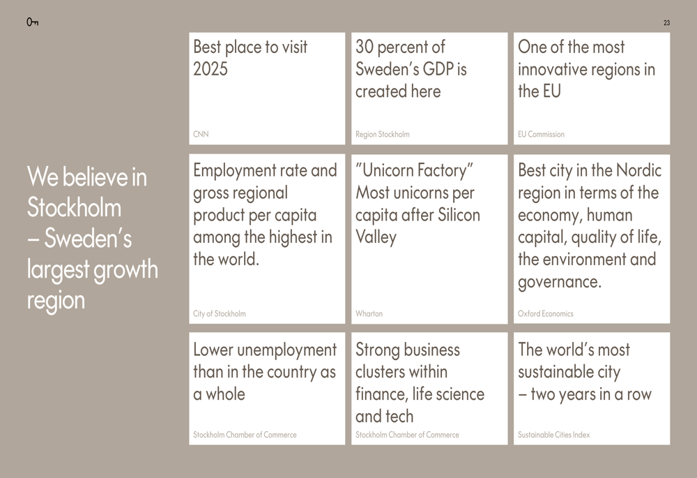 Fabege emphasizes its strategic positioning in Stockholm, which it describes as Sweden’s largest growth region. The company highlights that Stockholm generates 30% of Sweden’s GDP and has been recognized as a best place to visit in 2025 by CNN. The presentation also notes Stockholm’s status as a highly innovative region with strong business clusters and recognition as the world’s most sustainable city.