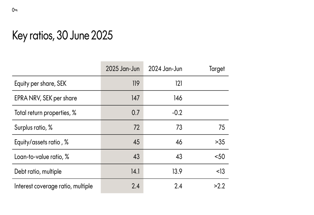 The following table presents Fabege’s key financial ratios, showing the company’s performance against targets: