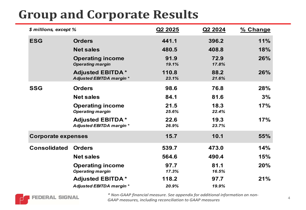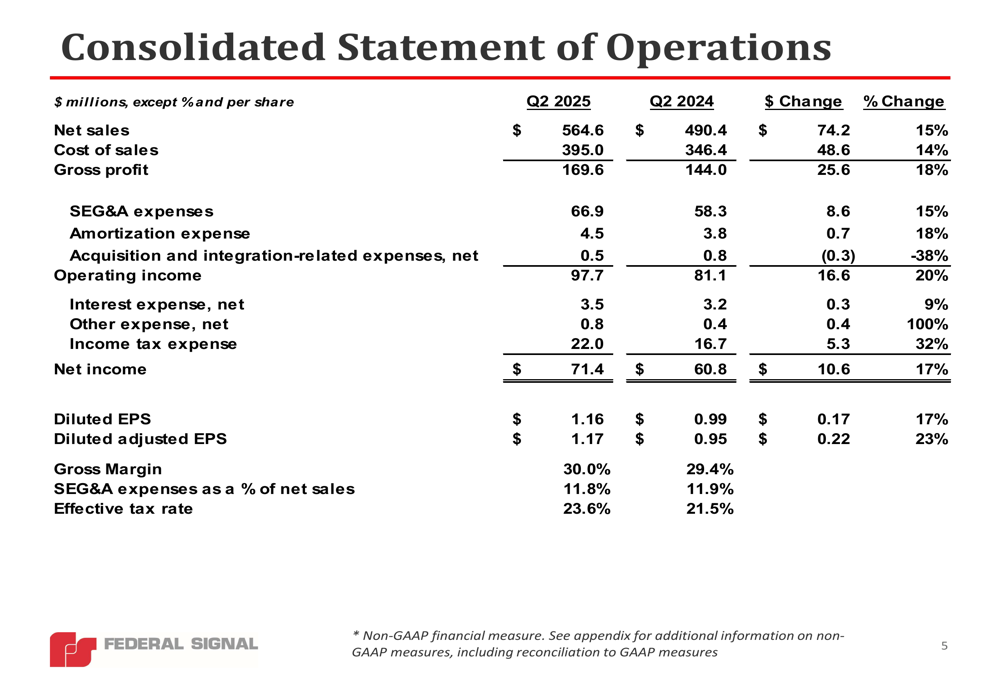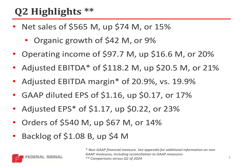 Federal Signal reported impressive financial results for Q2 2025, setting new quarterly records across multiple metrics. Net sales reached $565 million, representing a 15% increase compared to the same period last year, with organic growth contributing 9% of this increase.