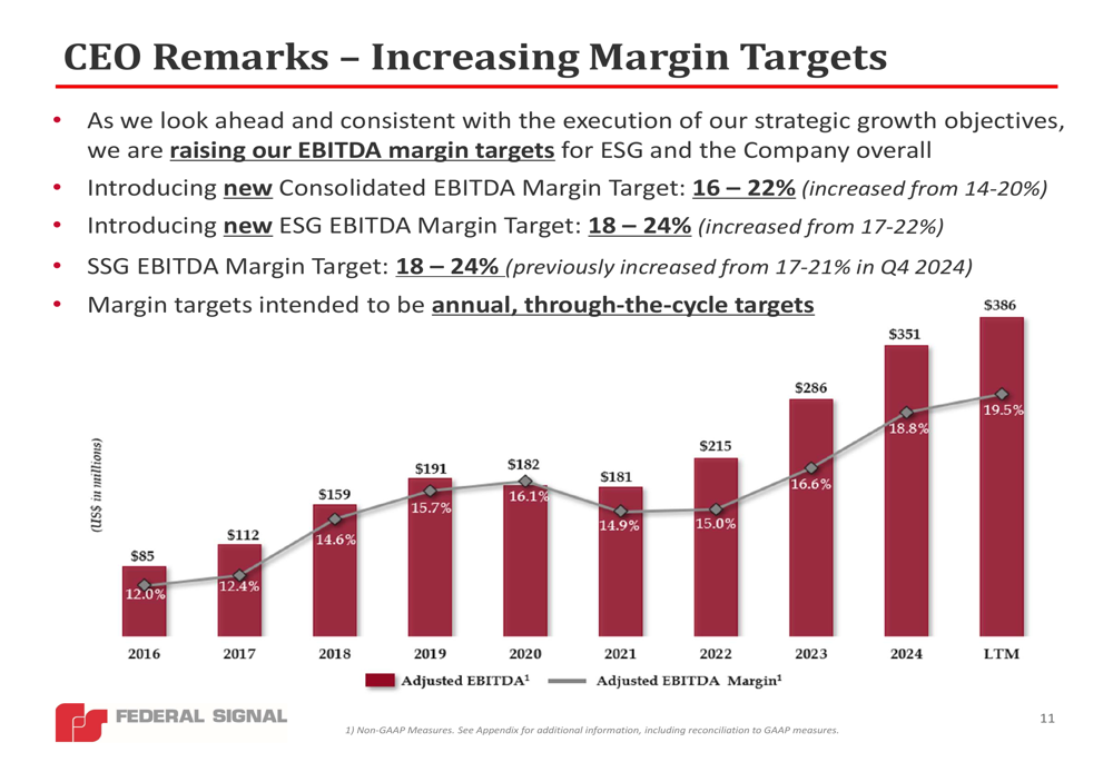 In addition to the near-term outlook, Federal Signal also raised its long-term margin targets. The company increased its consolidated EBITDA margin target to 16-22% (from 14-20%) and its ESG EBITDA margin target to 18-24% (from 17-22%), while maintaining the SSG EBITDA margin target at 18-24%.