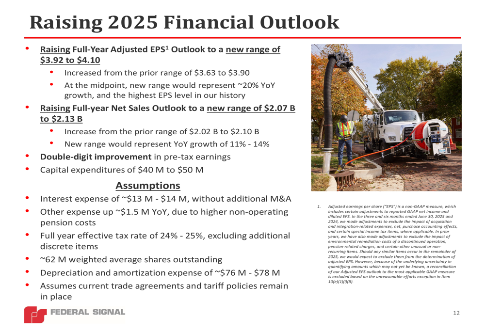 Federal Signal’s Q2 2025 results demonstrate the company’s ability to execute its strategic initiatives while delivering strong financial performance. With raised guidance, increased margin targets, and a solid financial position, the company appears well-positioned to continue its growth trajectory through the remainder of 2025 and beyond.