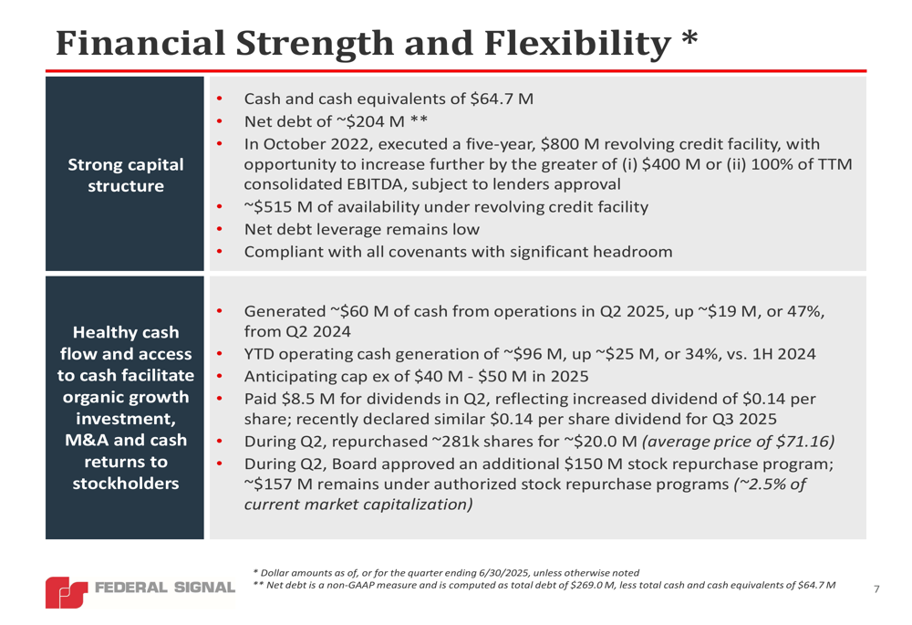Federal Signal maintained a strong financial position, with cash and cash equivalents of $64.7 million and net debt of approximately $204 million at the end of Q2 2025. The company has significant financial flexibility with approximately $515 million of availability under its revolving credit facility.