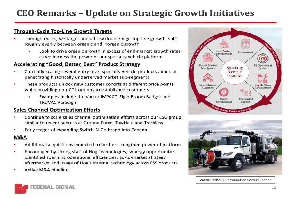 Federal Signal outlined several strategic growth initiatives aimed at sustaining its momentum. The company is targeting annual low double-digit top-line growth, split roughly evenly between organic and inorganic growth, by leveraging its specialty vehicle platform.