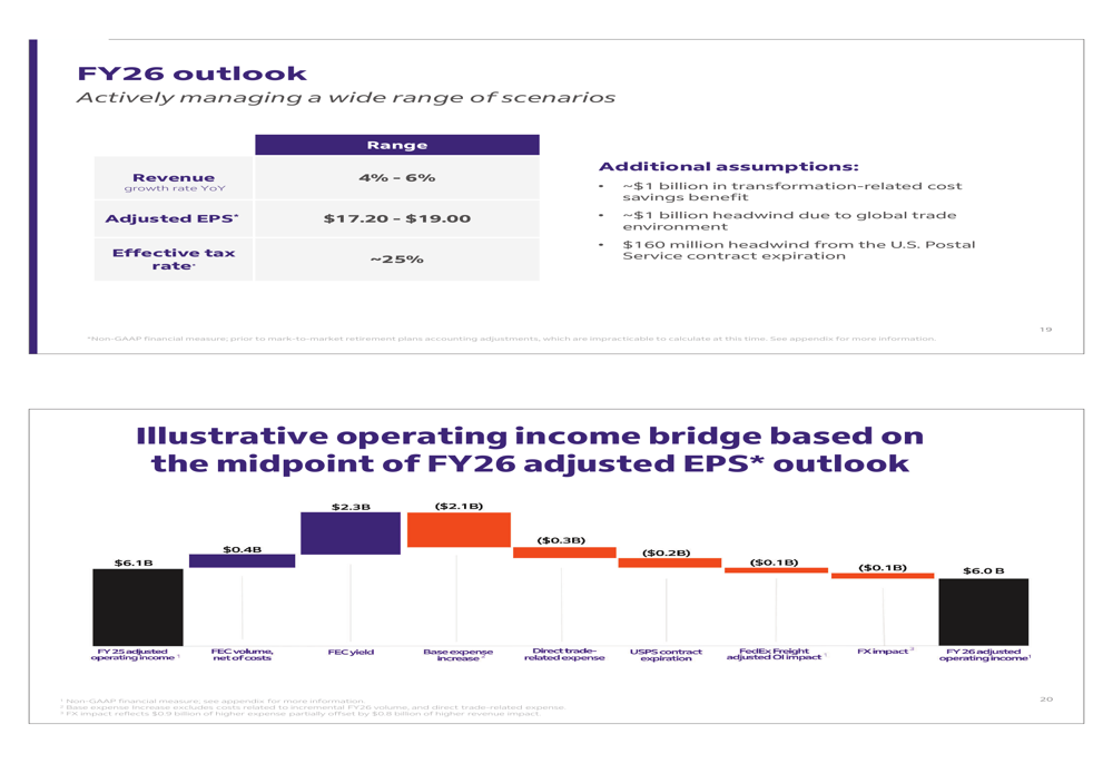 The following slide presents FedEx’s fiscal year 2026 outlook and illustrative operating income bridge:
