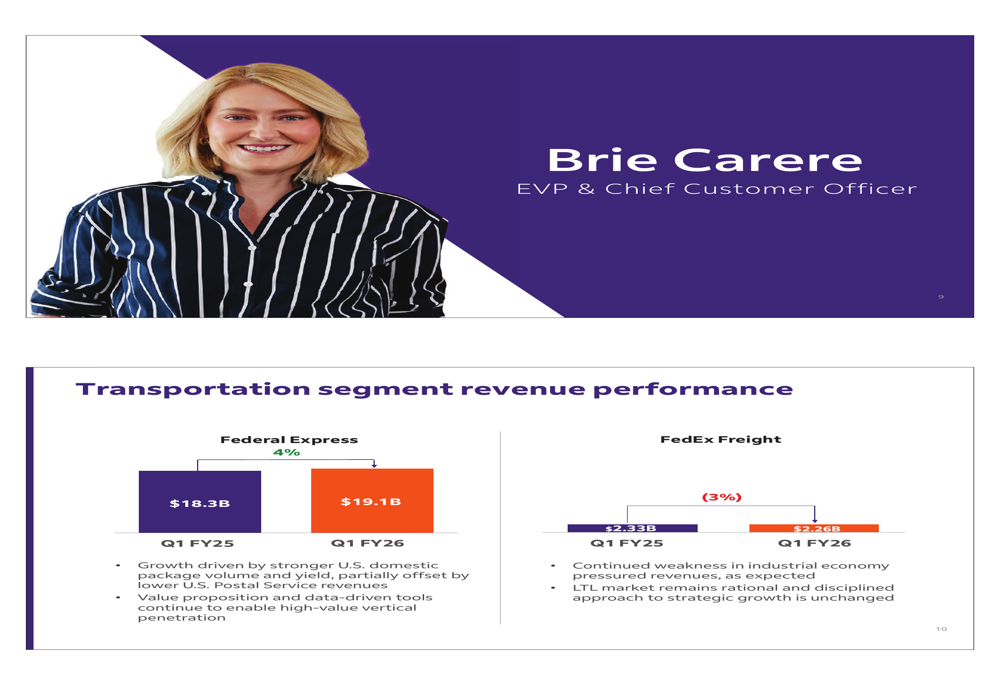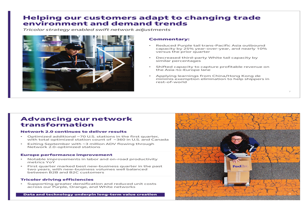 FedEx continues to advance its transformation initiatives, with Network 2.0 delivering tangible results through optimized stations and improved efficiency. The company highlighted its ability to adapt to the changing trade environment through its "Tricolor" strategy, which enables swift network adjustments.