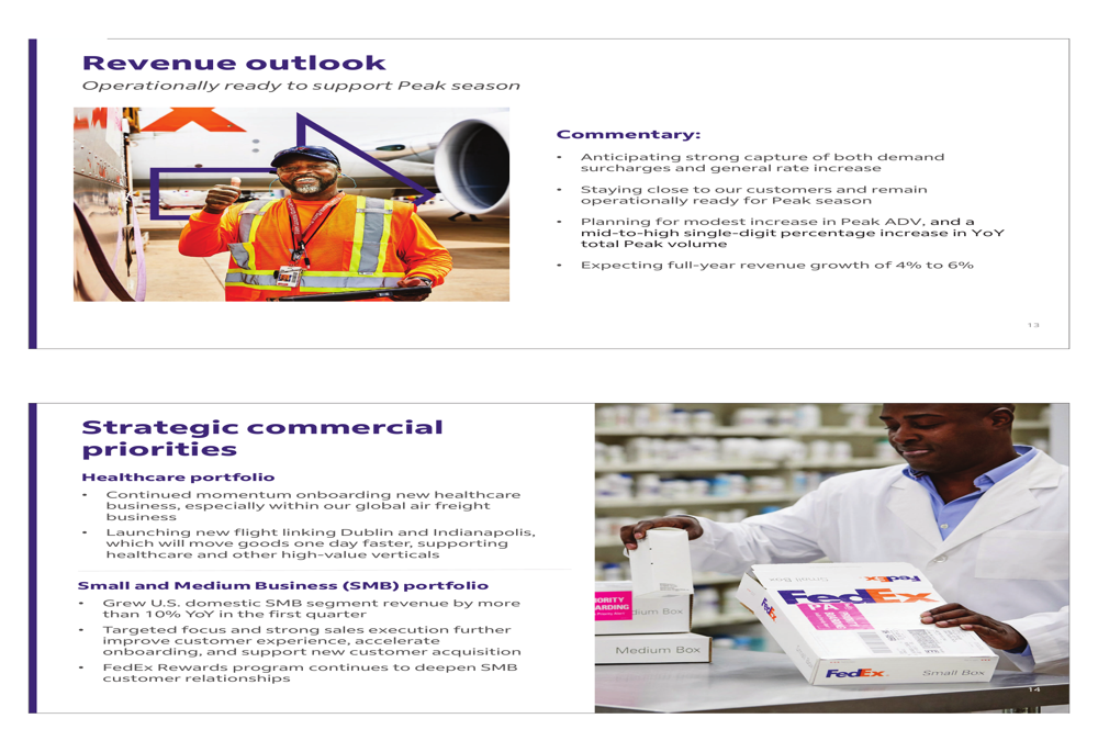 On the commercial front, FedEx is focusing on high-value verticals, particularly in healthcare and small and medium businesses (SMB). The company reported that its U.S. domestic SMB segment revenue grew by more than 10% year-over-year in the first quarter, reflecting targeted focus and strong sales execution.