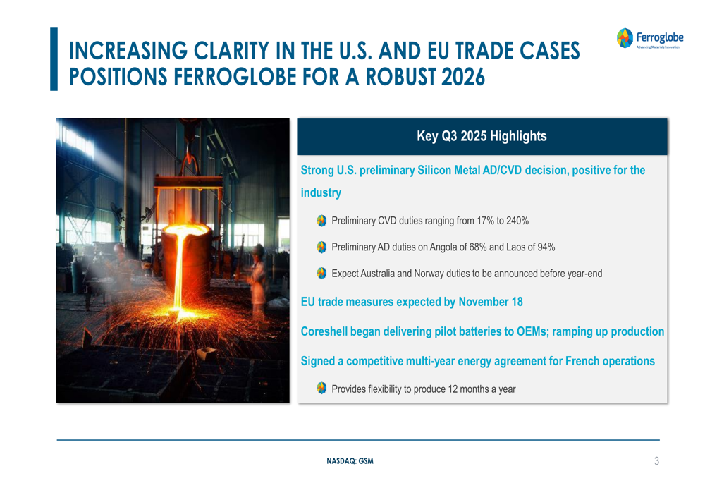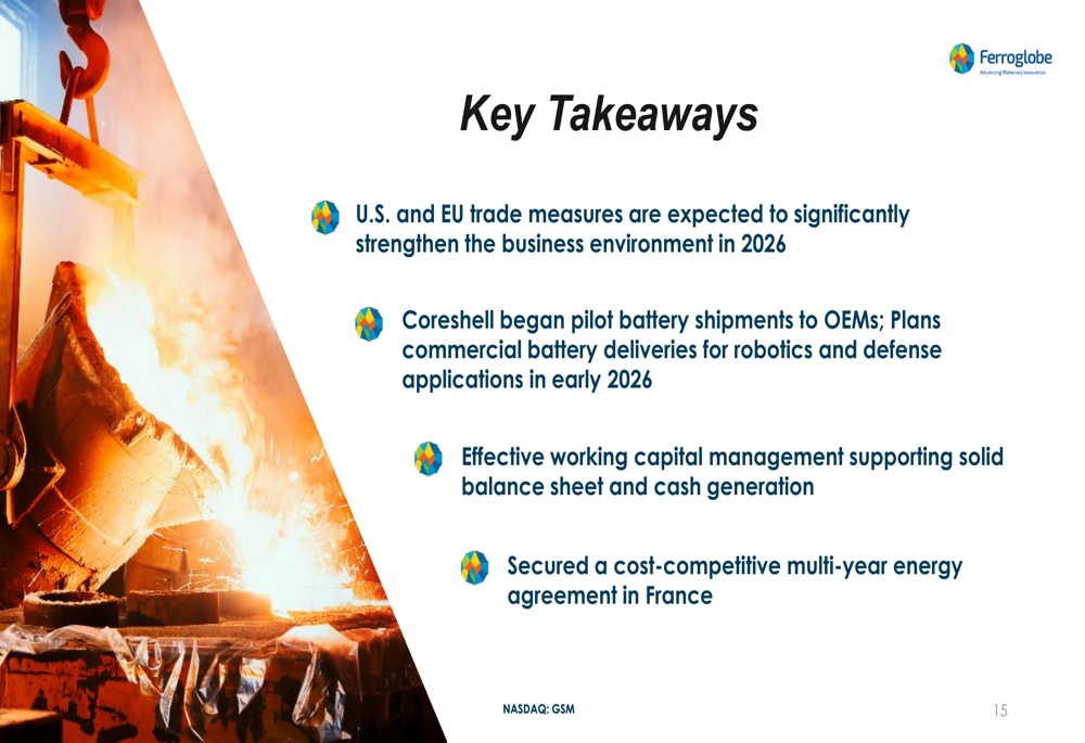 Ferroglobe reported progress on key strategic initiatives that position the company for future growth. The partnership with Coreshell for silicon anode technology is advancing, with pilot batteries being delivered to OEMs and plans for commercial battery deliveries for robotics and defense applications in early 2026.