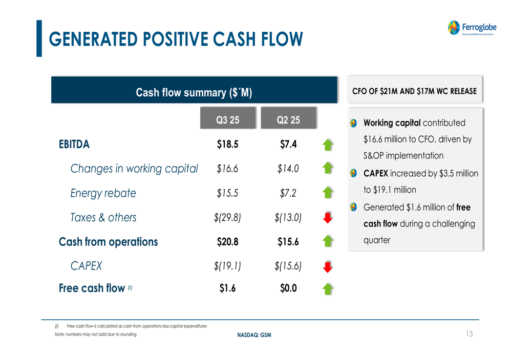 Despite the challenging market environment, Ferroglobe generated positive operating cash flow of $20.8 million in Q3 2025, supported by effective working capital management and energy rebates. Capital expenditures increased to $19.1 million, resulting in free cash flow of $1.6 million for the quarter.