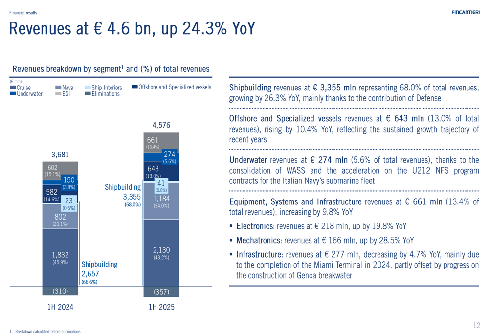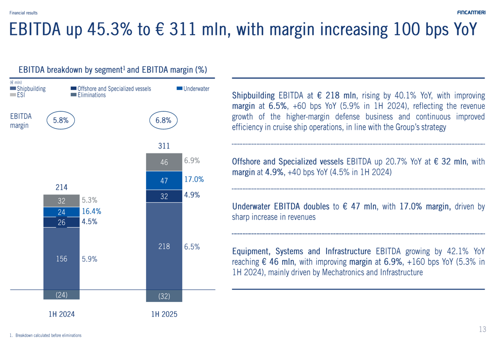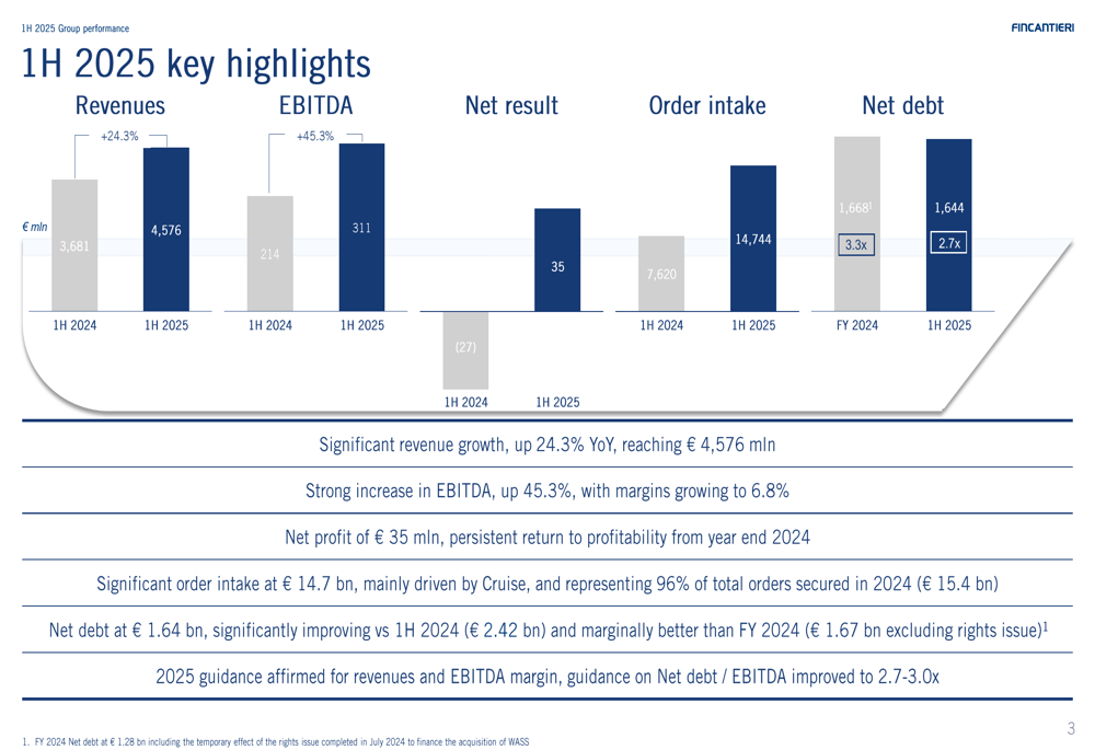 Fincantieri reported revenues of €4.58 billion for the first half of 2025, representing a 24.3% increase compared to the same period last year. This growth was accompanied by a 45.3% jump in EBITDA to €311 million, with the EBITDA margin expanding by 100 basis points to 6.8%.