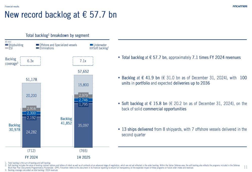 The backlog provides exceptional visibility on future revenues, with scheduled deliveries extending to 2036. During the first half of 2025, Fincantieri delivered 13 ships from 8 shipyards, including 3 cruise ships, 1 naval vessel, and 9 offshore vessels.