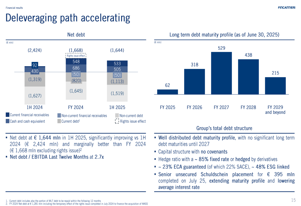 Fincantieri has made significant progress in strengthening its financial position, with net debt reduced to €1.64 billion in 1H 2025, down from €2.42 billion in 1H 2024. This improvement has brought the Net Debt/EBITDA ratio down to 2.7x.