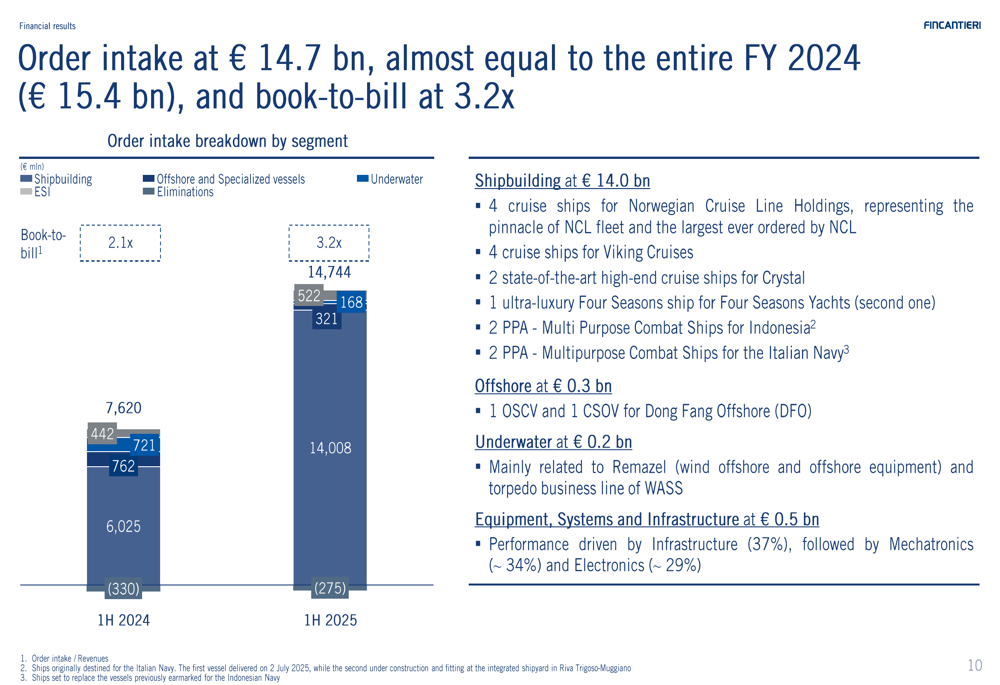 Perhaps the most striking aspect of Fincantieri’s performance was the exceptional order intake, which reached €14.7 billion in the first half of 2025—nearly equal to the entire FY 2024 order intake of €15.4 billion. This resulted in a book-to-bill ratio of 3.2x, indicating strong future revenue potential.