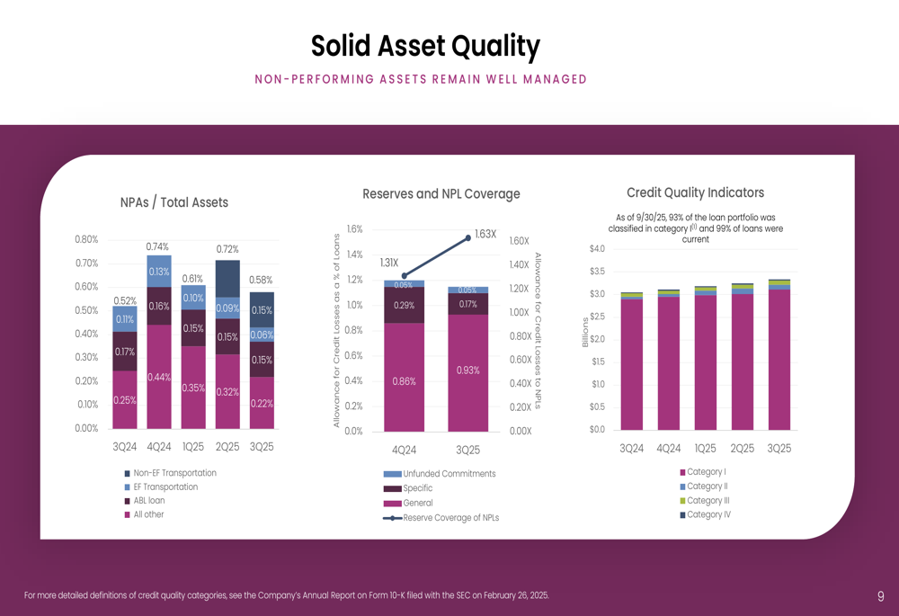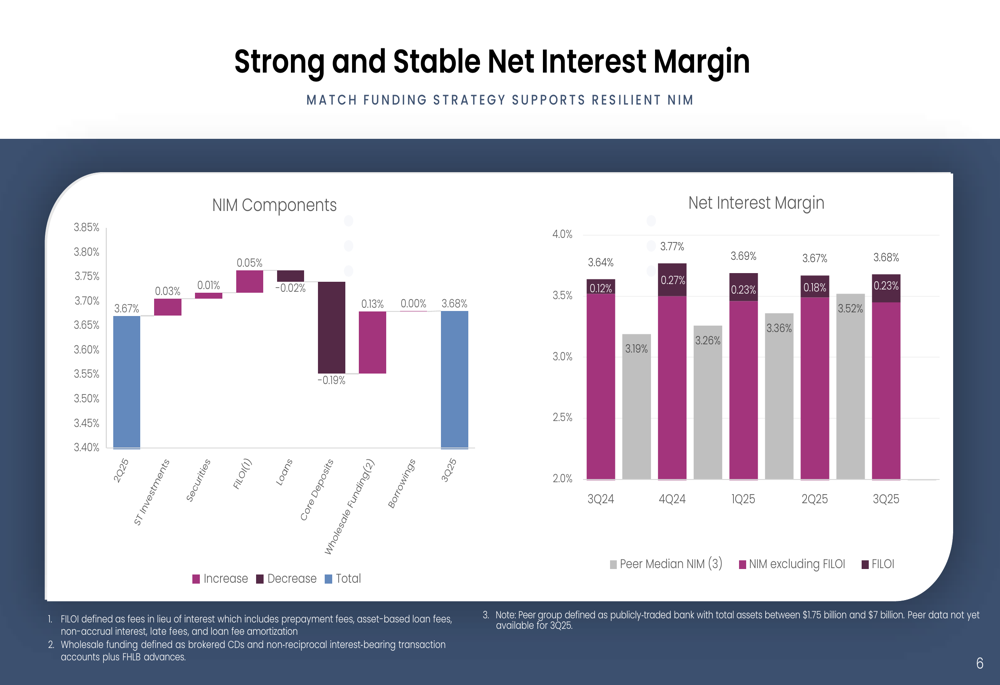 This stability is achieved through a methodical approach to interest rate risk management, including individually match-funding loans with maturities over 5 years and amounts greater than $5 million, and portfolio match-funding for smaller loans. The bank maintains a balanced mix with 58% of its portfolio in floating-rate loans (predominantly SOFR-indexed) and 42% in fixed-rate loans as of September 30, 2025.