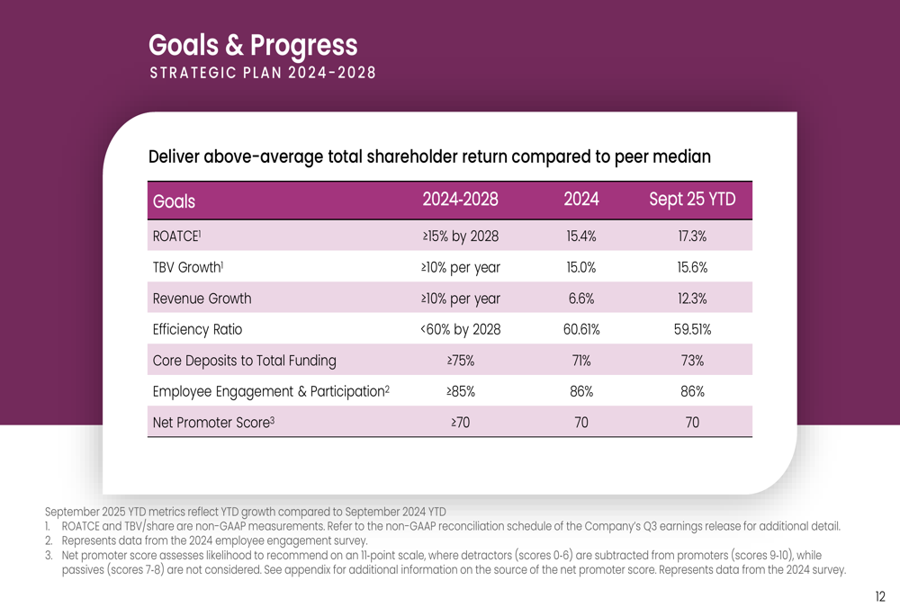 The efficiency ratio has improved to 59.51% year-to-date, already below the 2028 target of 60%. Core deposits as a percentage of total funding have increased to 73%, moving closer to the 75% goal. Employee engagement and Net Promoter Score metrics remain strong at 86% and 70, respectively, both meeting or exceeding targets.