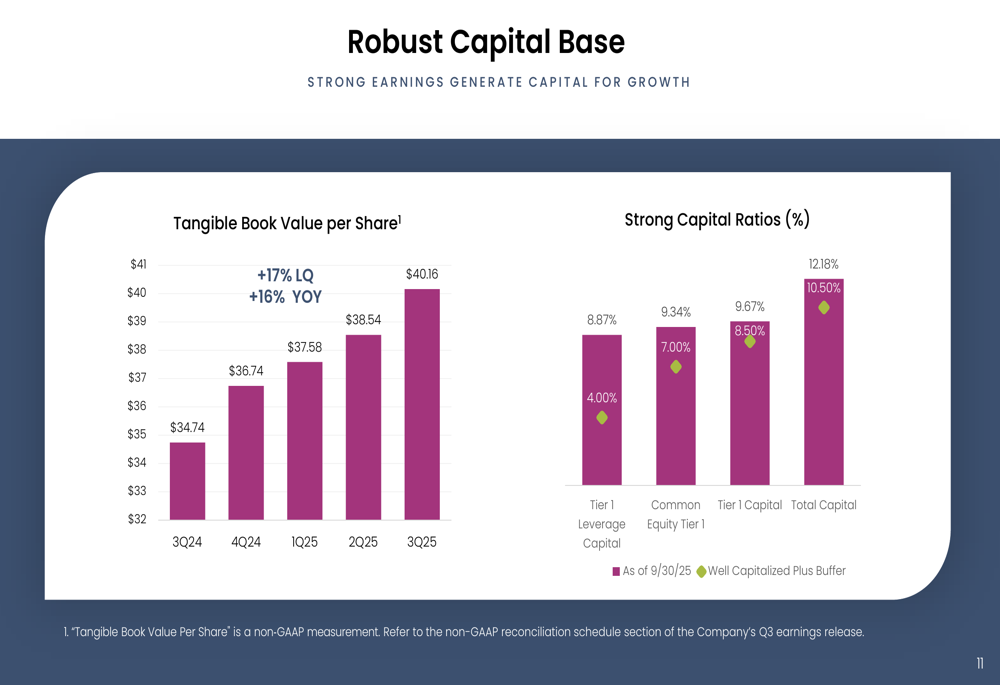 The company’s capital position continues to strengthen, with tangible book value per share increasing by 16.8% annualized from the linked quarter and 15.6% year-over-year, reaching $40.16 as of Q3 2025. Capital ratios remain robust, with Common Equity Tier 1 at 8.50% and Total Capital at 10.50%.