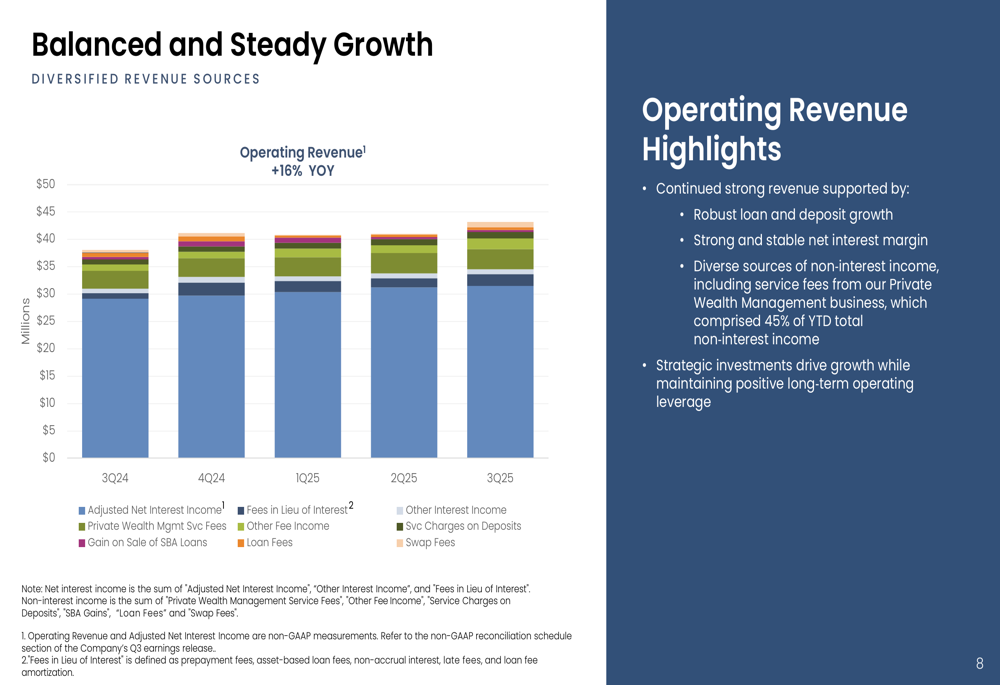 The bank’s Q3 2025 results demonstrated broad-based growth across key metrics, with operating revenue increasing 16.3% year-over-year and pre-tax, pre-provision earnings growing 20% year-to-date. Net income for the first nine months of 2025 increased by 25% compared to the same period in 2024.