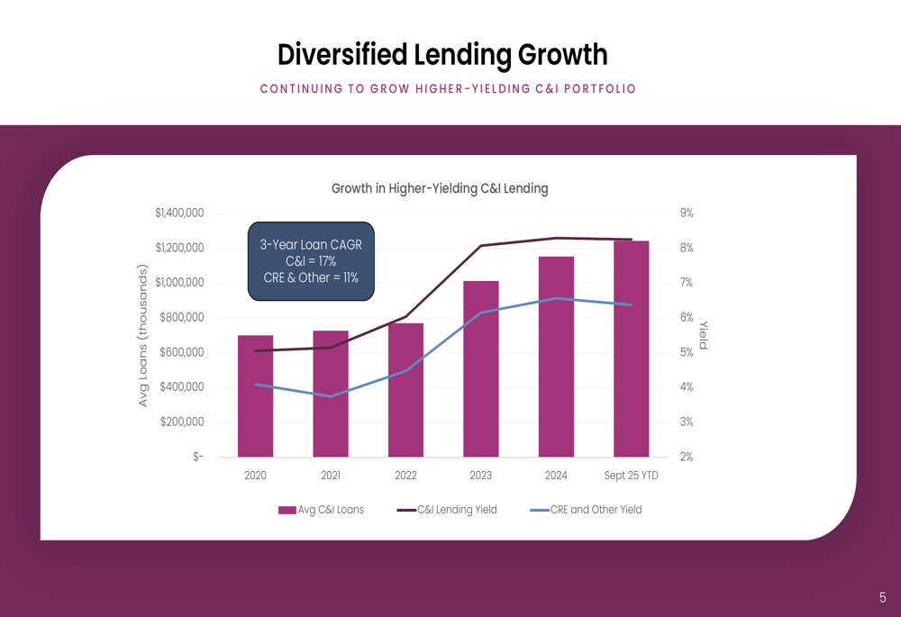 The bank’s lending portfolio shows diversification with particular strength in Commercial and Industrial (C&I) lending, which has grown at a 17% CAGR over the past three years, outpacing the 11% growth in Commercial Real Estate (CRE) and other loans. This focus on C&I lending has contributed to higher yields in the overall loan portfolio.
