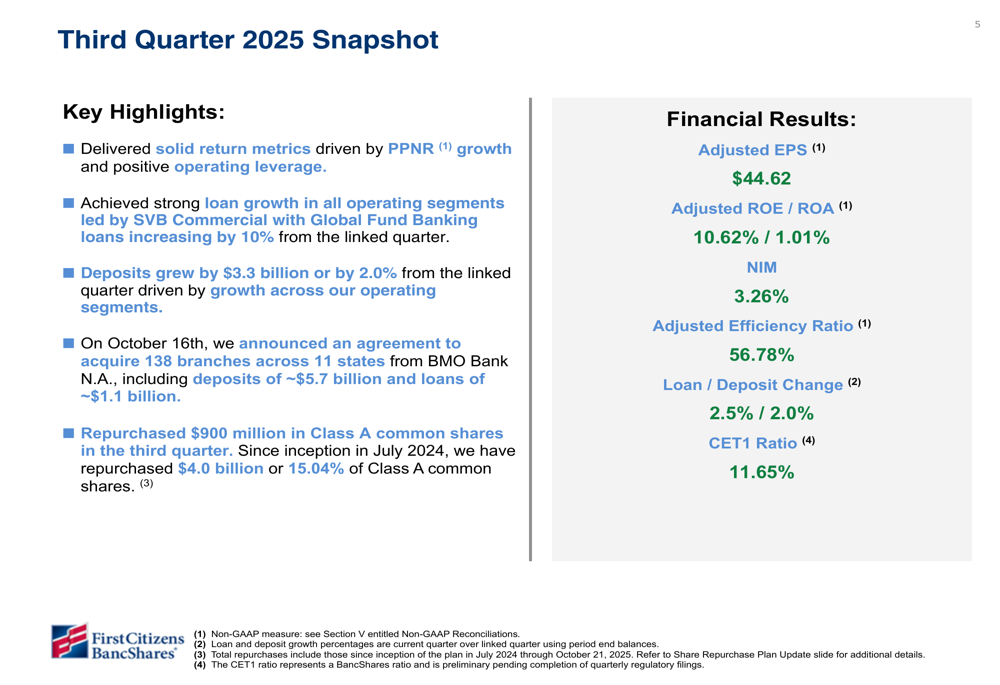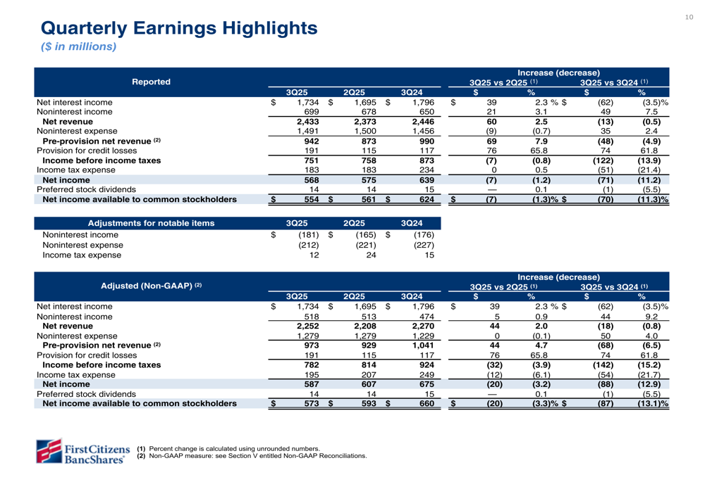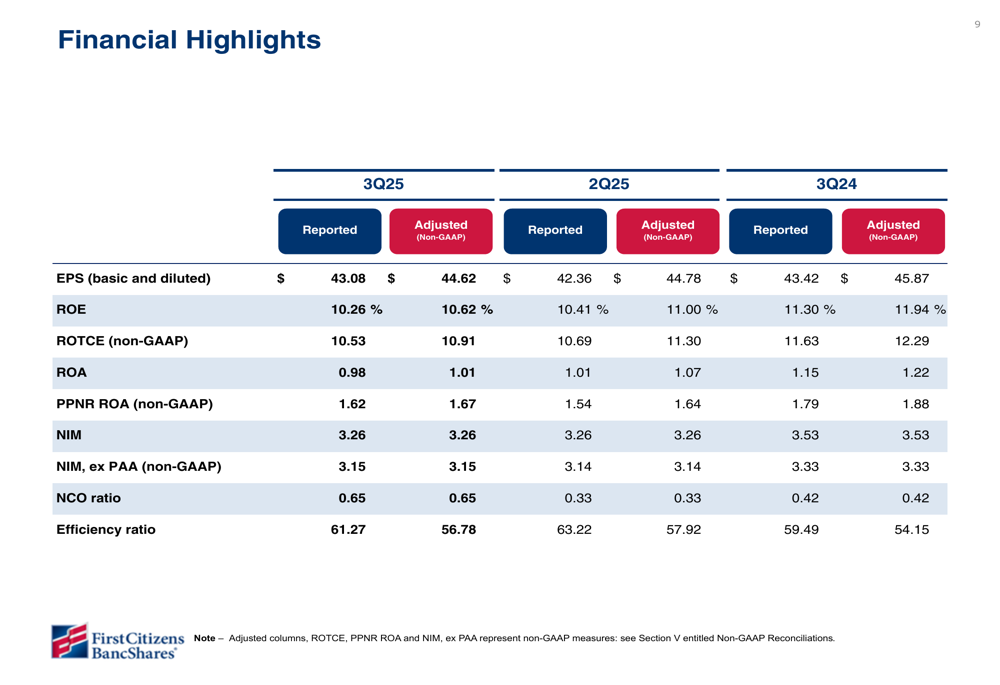 First Citizens delivered solid financial performance in Q3 2025, with adjusted return metrics driven by pre-provision net revenue growth and positive operating leverage. The company achieved an adjusted return on equity of 10.62% and return on assets of 1.01%, though both metrics declined from the year-ago period.