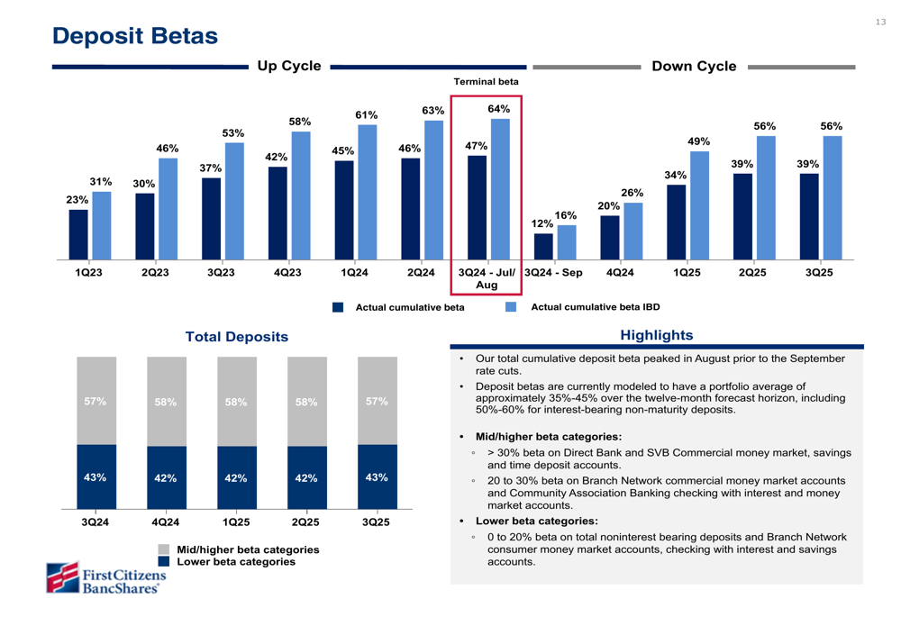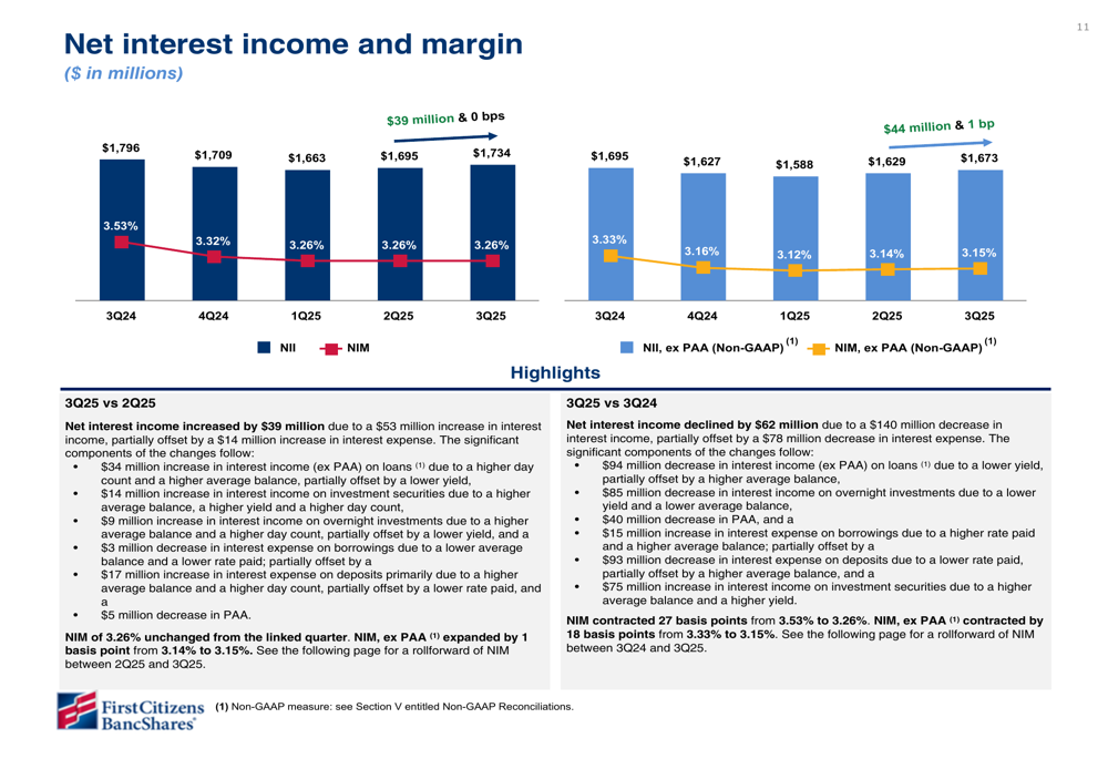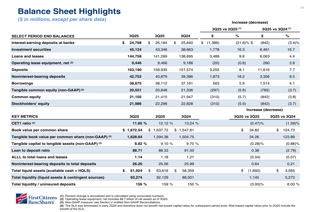 The company’s capital return strategy remained aggressive, with $900 million in Class A common shares repurchased during the third quarter. Since the inception of the repurchase program in July 2024, First Citizens has repurchased $4.0 billion or 15.04% of Class A common shares, demonstrating its commitment to returning capital to shareholders while maintaining a strong CET1 ratio of 11.65%.