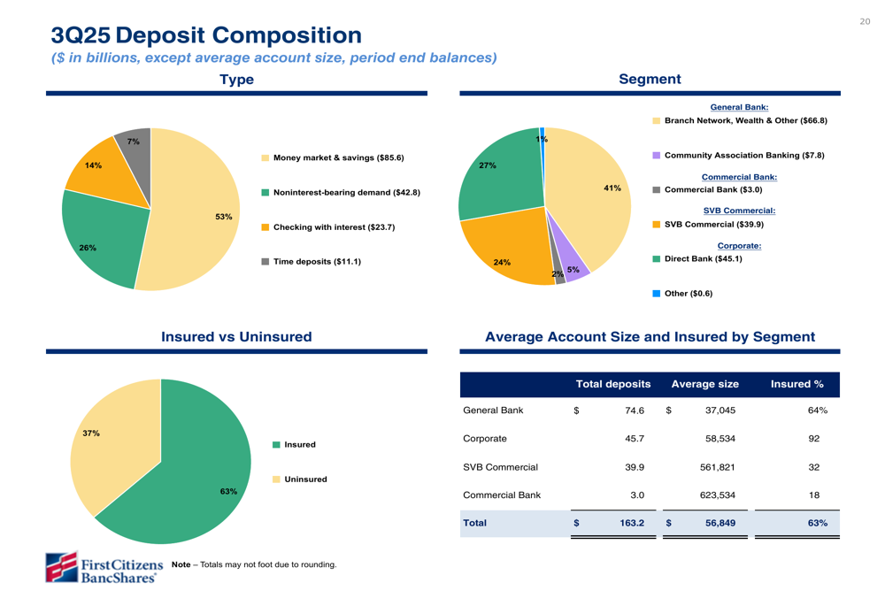 The company’s deposit composition remains diversified, with money market and savings accounts comprising the largest portion at $85.6 billion, followed by noninterest-bearing demand deposits at $42.8 billion. The company’s deposit base is 37% insured and 63% uninsured, with significant variations in insurance coverage across segments.