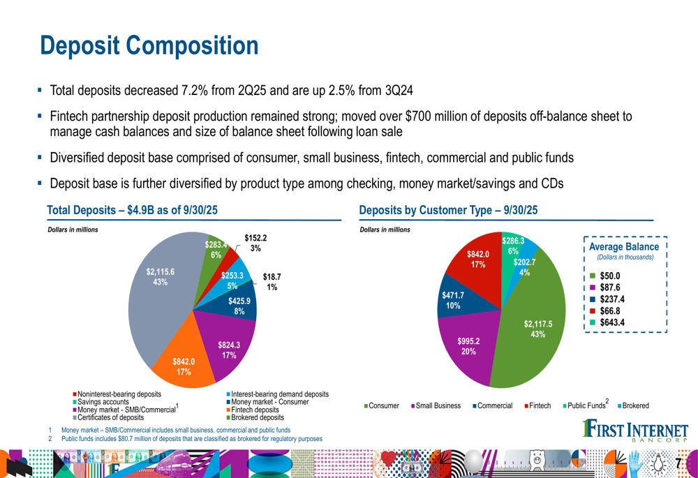 First Internet’s deposit strategy continues to leverage its Banking-as-a-Service (BaaS) model and fintech partnerships to drive liquidity. Total deposits decreased 7.2% from the previous quarter but remained 2.5% higher than the same period last year. The company noted that it moved over $700 million of deposits off-balance sheet to manage cash balances following the loan sale.
