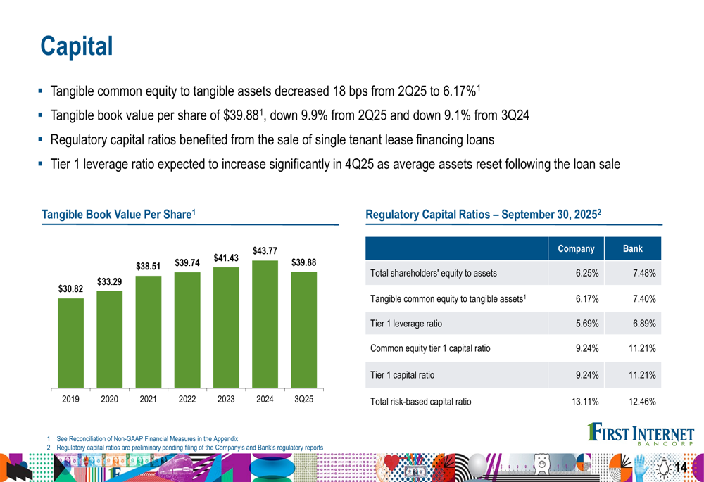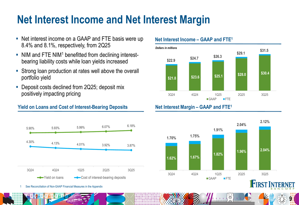 Looking ahead, First Internet projects loan balance growth of 4-6% for Q4 2025 and expects net interest margin to improve to between 2.4% and 2.5%. The company anticipates net interest income of $32.75-$33.5 million and continued yield enhancement in its loan portfolio.