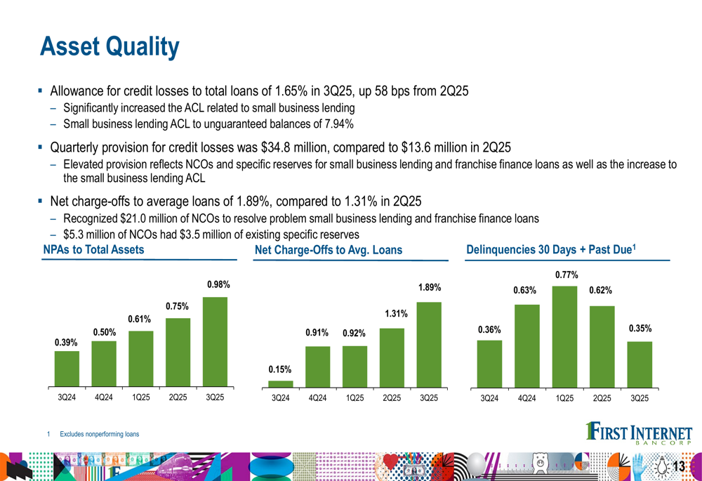 First Internet’s presentation highlighted "improving asset quality" as a key business achievement, particularly noting a 79% reduction in franchise finance delinquencies. However, broader asset quality metrics showed some deterioration, with non-performing assets to total assets increasing to 0.98% and net charge-offs to average loans rising to 1.89%.