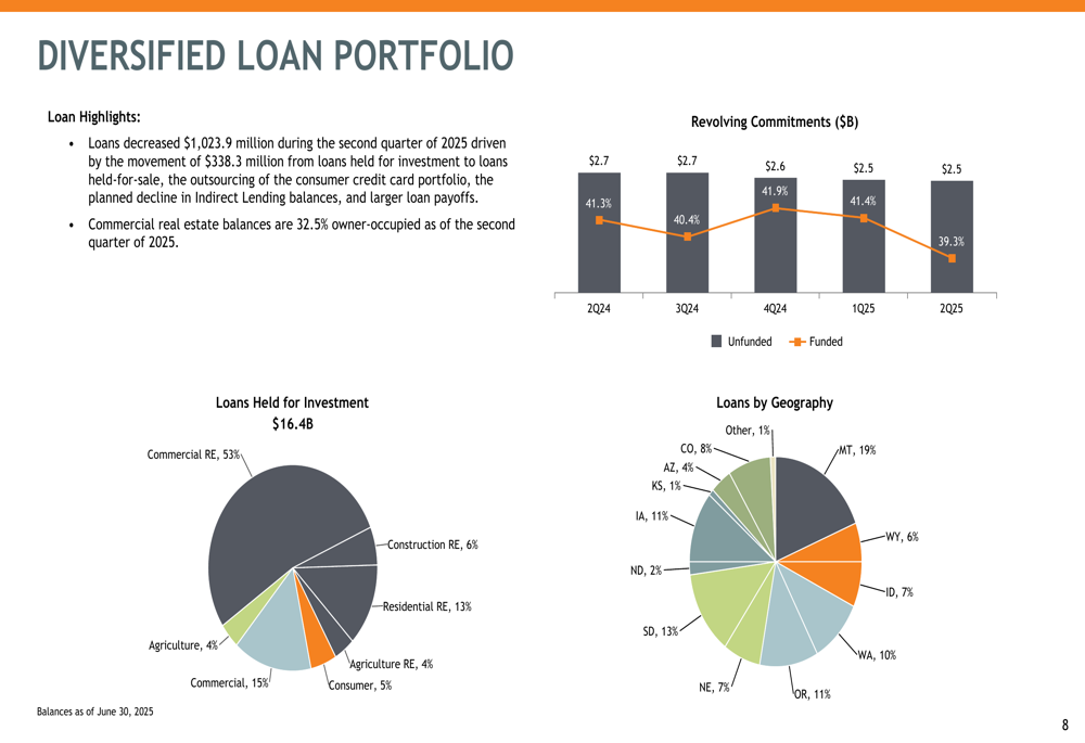 First Interstate BancSystem’s loan portfolio decreased by $1.02 billion during Q2 2025, largely reflecting the strategic decision to exit indirect lending and prepare for the sale of Arizona and Kansas operations. The company maintains a well-diversified loan portfolio, with commercial real estate representing 53% of total loans, residential real estate at 13%, commercial loans at 25%, agricultural loans at 4%, and consumer loans at 5%.
